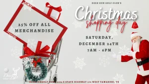 Join us for a Christmas shopping day at Deer Run Golf Club! All merchandise will be 25% off! This is a perfect time to visit your last-minute Christmas shopping! See you Saturday, December 24th!