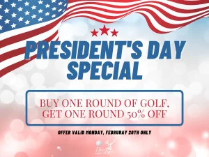 Join us for President’s Day at Deer Run Golf Club! BOGO 50% golf! One player will pay full price, the second player will receive 50% regular price! See you Monday, February 20th!